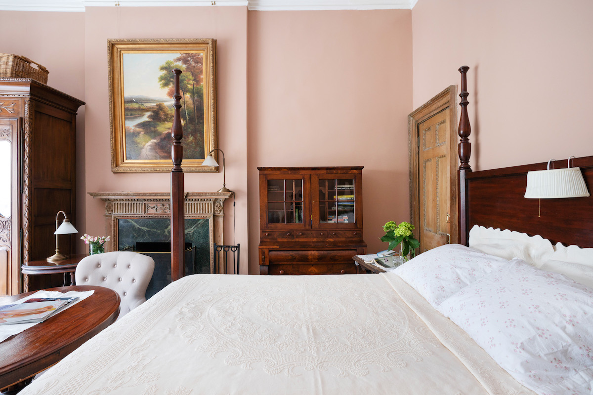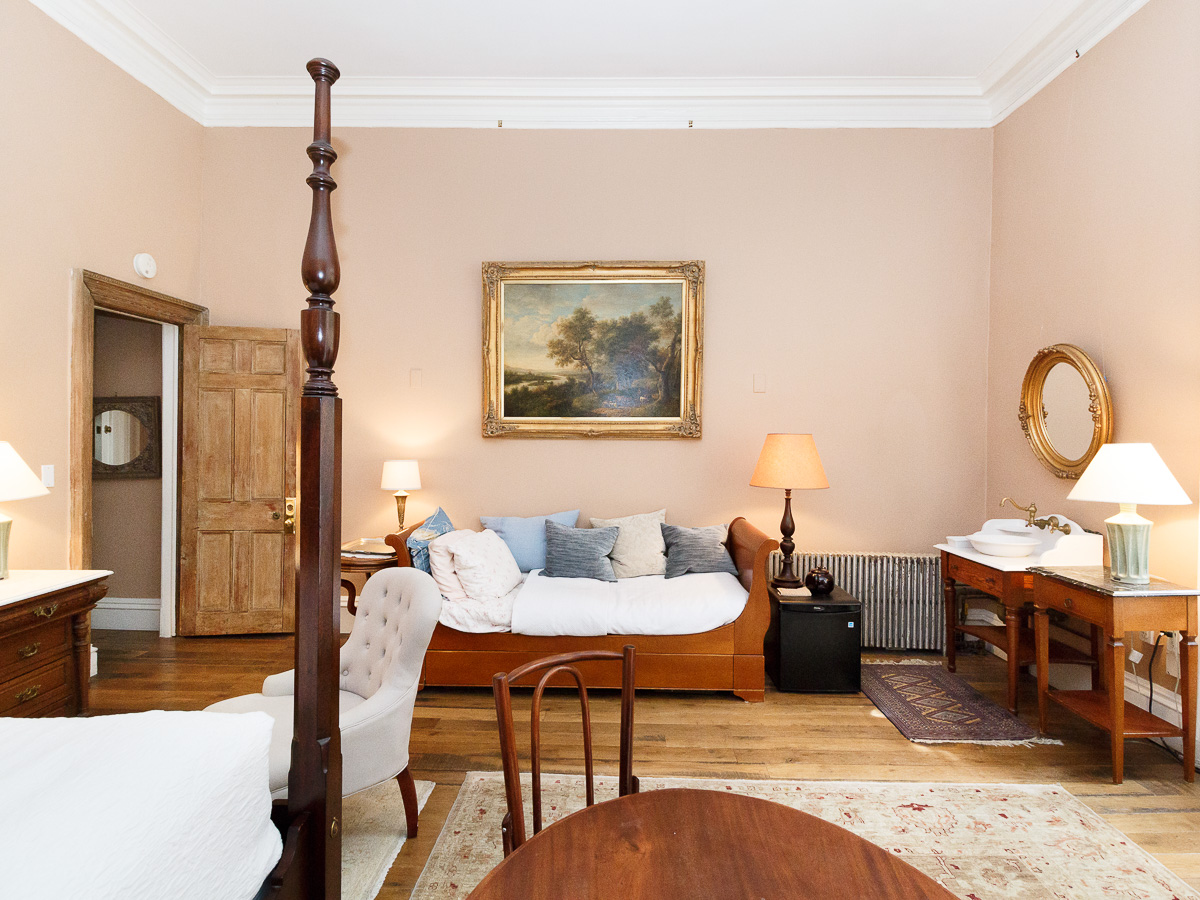 Though some guests will no doubt want to spend much of their time on the terrace, the Garden Room itself makes for an extraordinary place to take a moment to yourself and enjoy a coffee or quiet drink away from the hustle of the city. Soaring 11’10” foot ceilings look down on this quiet room and its carved wood and marble fireplace mantle, tall Normandy armoire, unique four-poster queen-size bed, and mahogany Philadelphia breakfast table. The room’s daybed makes for an enticing nap spot! Another period throwback can be found in the southeast corner: a sculptured ceramic washbasin with wooden cabinet, augmenting the hand basin found in the bathroom.