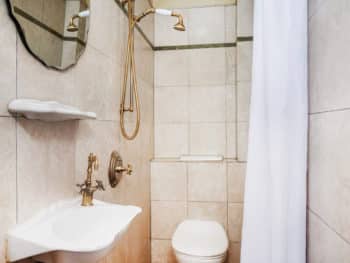 Please note that there is no kitchen or access to a kitchen in the apartment. Provided is a small fridge, electric kettle, small microwave oven and sink in the room. The bathroom is a fully tiled, narrow space with antique style brass hardware and a merged shower and toilet area.